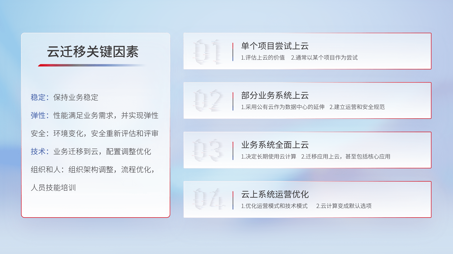 结合实际业务,,,,从规划设计、、云平台选型、、、、云原生改造、、数据迁移、、、、集成交付,,,迁移全过程为客户识别最佳上云路径,,,做好风险识别管理,,,,设计网络架构、、、、身份权限、、安全审计合规、、、、操作审计、、、、日志审计、、、监控告警策略、、多站点容灾设计等,,,对云上基础设施进行整体规划,,,,提升IT治理水平,,以满足弹性、、、、高可用、、高性能的需求。。。。